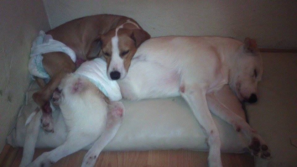 Handicapped Zaga likes to use handicapped Teo as a cushion. The red spots on Teo’s body are remainders of his terrible wounds. The dermalibour cream that was sent to their foster mom Silvija in Skopje, Macedonia, will be used to regenerate the skin tissue on those spots. Of course the cream will also be used for Zaga and Ava (the other handicapped dog fostered by Silvija), because they had serious wounds as well.
