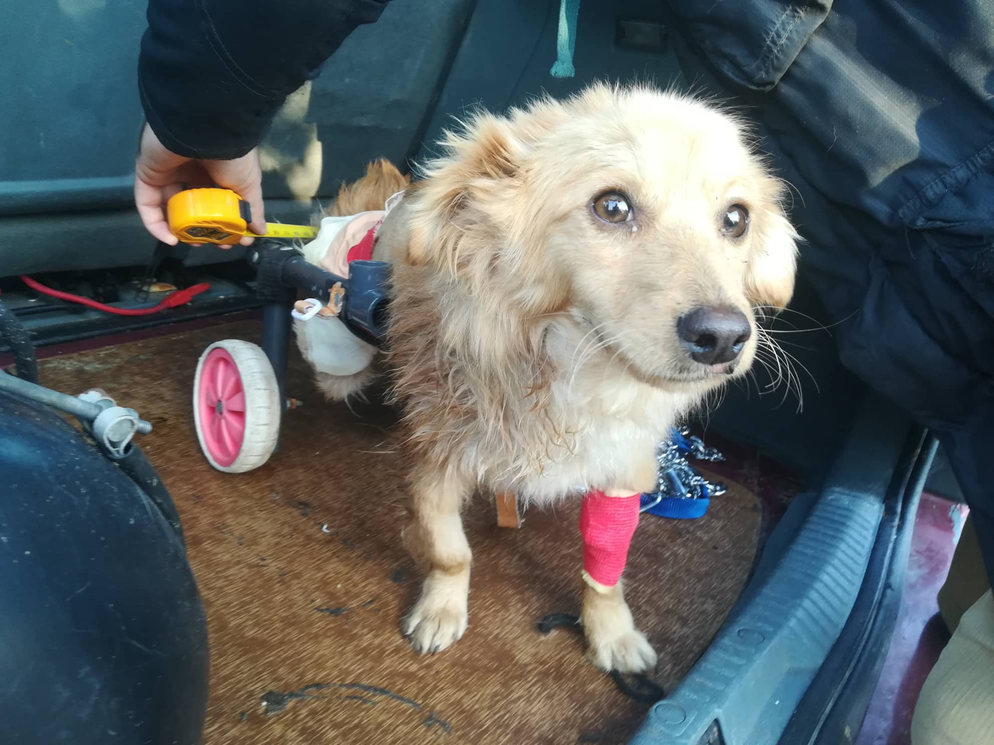 Hope, handicapped dog, rescued by NGO Ruka-Sapi and fostered in Montenegro, facilitating fundraiser and providing wheelchair